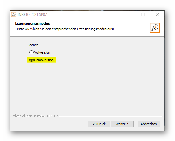 Zur Installation der DemoVersion auf den Client - PC's, benötigen Sie während der Installation