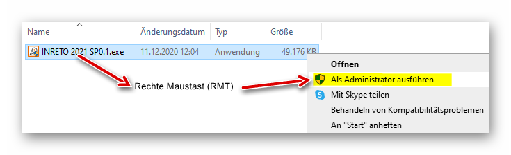 lKlicken Sie mit der rechten Maustaste auf „INRETO 20xx SPxx.exe“ und wählen in dem Auswahlfenster "Als Administrator ausführen"