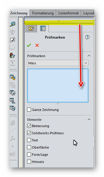 Durch Aktivierung von "Ganze Zeichnung" und der Auswahl der gewünschten Elementen, wird auf allen vorhanden Blätter an allen gewählten "Elemente", in der Reihenfolge wie oben beschrieben, ein Prüfsymbol gesetzt.