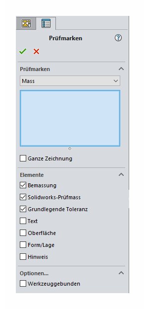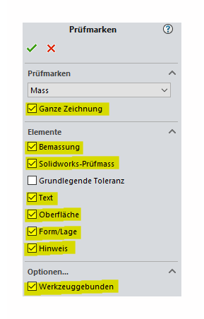 "Bemassung , Solidworks - Prüfmass und Grundlegende Toleranz" sind schon aktiviert, können jedoch abgewählt werden.Alle anderen werden durch anklicken aktiviert. .