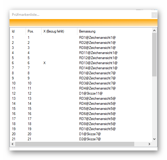 - X (Bezug fehlt) = EIn "X" in dieser Spalte wird nur dann dargestellt, wenn die Prüfmarke den Bezug (Maß, Text, usw.) verloren hat.