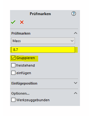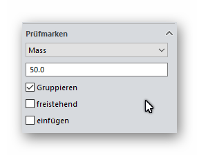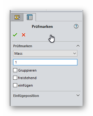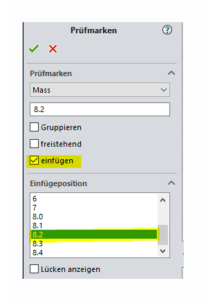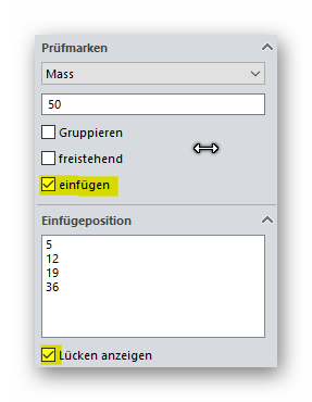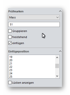 Sollen in einer vorhandenen Gruppe, eine Prüfmarke ergänzt werden, die aus der Mitte der Gruppe gewählt wird, dann muss die "einfügen" sowie die gewünschte "Einfügeposition" gewählt werden. Danach kann die Prüfmarke in der Zeichenansicht gesetzt werden.
