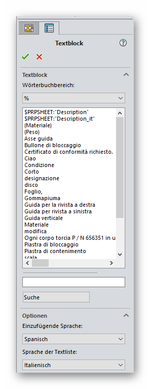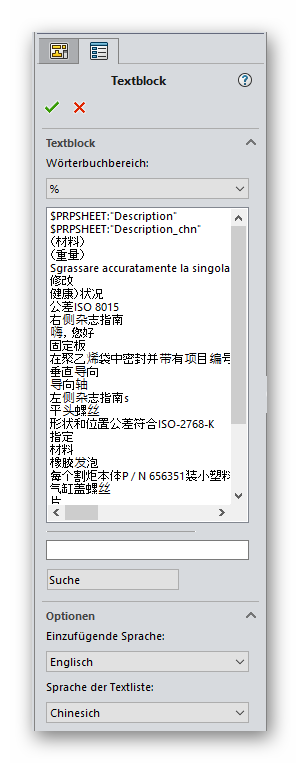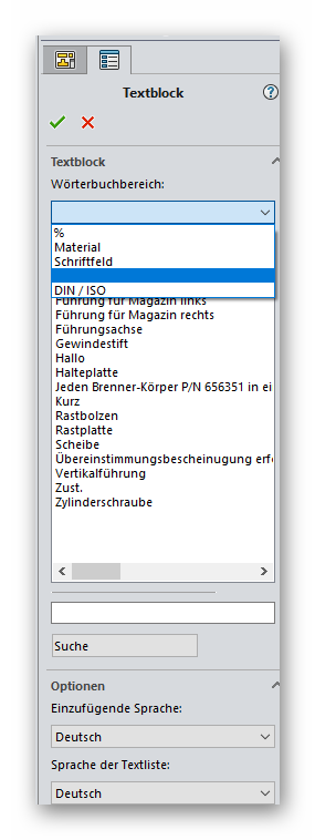 Hier kann die Sprache ausgewählt werden, mit der die Texte in die 2D - Zeichnung eingefügt wird.