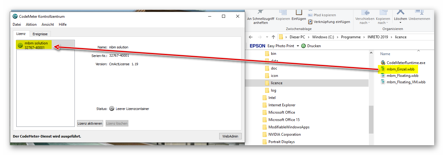 Ziehen Sie die „mbm_Einzel.wbb“ – Datei aus dem LANDMAN Installationsordner "licence" per „Drag and Drop“ in das linke Fenster des „CodeMeterControlCentrum (CMCC).