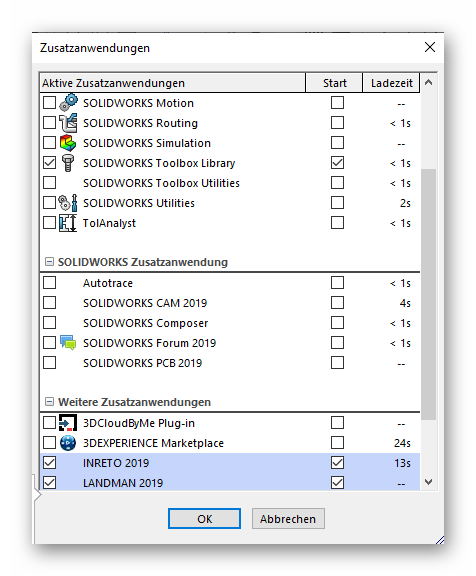 LANDMAN aktivieren/deaktivieren Im SOLIDWORKS-Menü Extras /Zusatzanwendungen müssen Sie unter Weitere Zusatzanwendungen "LANDMAN 20xx" aktivieren bzw. deaktivieren.