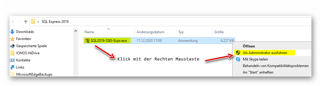 Nach dem erfolgreichen Download klicken Sie auf die "SQL2019-SSEI-Expr.exe" mit der rechten Maustaste